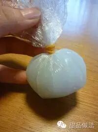 还有一种方法,就是把皮先铺在沾水的保鲜膜里,然后放豆沙馅再如图包起来等放凉