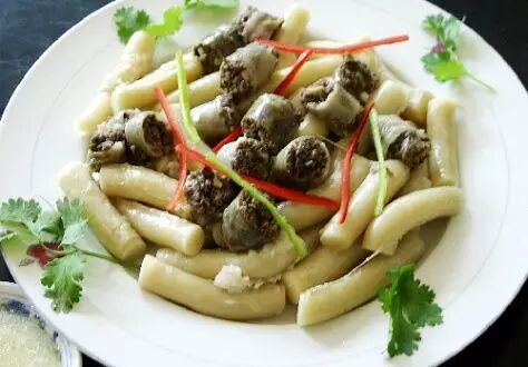 酿皮子是临夏人民最喜爱的风味小吃之一。酿皮子是一种独特的面食,既可作为主食,也可作为零食,清凉可口,开胃解暑。其作法很简单:先将优质面粉加水揉成硬团,在清水中反复搓洗,使面粉中的蛋白质与淀粉分离,分离出来的蛋白质俗称“面筋”,将它蒸熟,切成薄片待用。洗出的淀粉溶于水中,待其沉淀在盆底后,把上面的清水倒掉,加入稍许碱,调成稀糊,舀入平底盆中,上笼蒸几分钟即熟。吃时,只需将作好的一张张酿皮子切成条状,配上面筋,加入适量酱油、香醋、蒜汁、盐、芝麻油、香菜、黄瓜丝、辣椒油调拌即可。一碟香辣可口的酿皮子就作好了。看那色泽晶莹黄亮,半透明如玉,青黄红白色泽鲜亮诱人。入口细腻润滑,酸辣筋斗、柔韧可口,是一种大众化的清凉面食。绝好的风味小吃。浆水还可作为夏季饮料,清肠利尿,有助于消化。