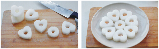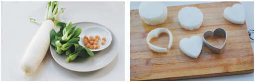2、将白萝卜切成干贝状厚度,使用模具刻成心形或其他形状备用。