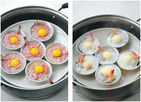 材料:虾6条 猪肉末150g 上海青6棵 鹌鹑蛋6个 火腿末1大匙 香菜末少许 小碗(我用的蛋挞模,或根据现有工具选择)