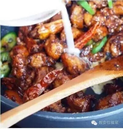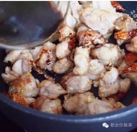 3、在锅中加入炸好的鸡块,炒至熟透;