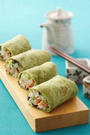 卷饼 2张 米饭 50克 菠菜 30克 香菇 20克 烟熏三文鱼 50克