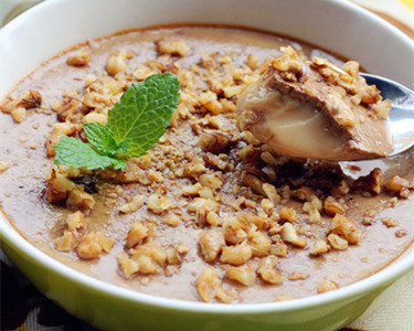 食材:鸡蛋2个、核桃3个、红糖适量、黄酒适量、水适量。