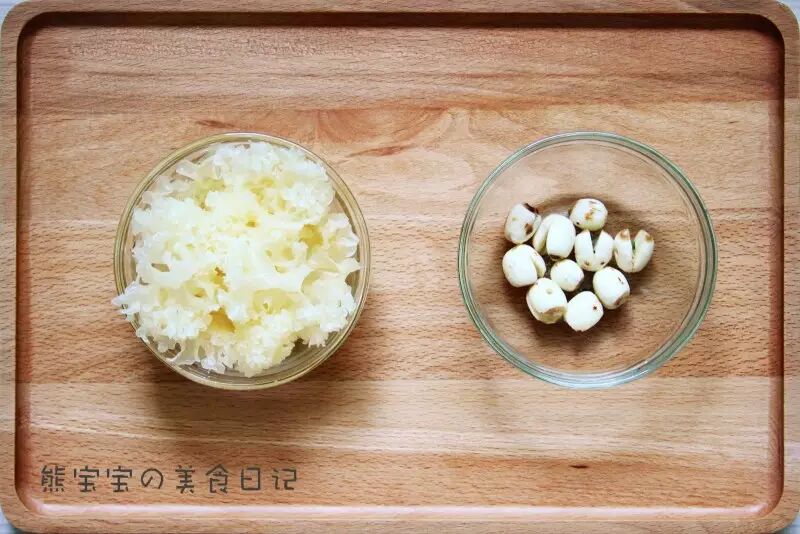 莲子和银耳提前泡好备用。银耳下面的根部需要剪掉,莲子如果有莲心则需要剔除。【银耳最好摘成小朵,这样熬出来的银耳羹会非常的粘稠哦~】