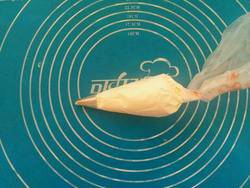 剩余一些淡奶油装入裱花袋备用。将蛋糕体从冰箱取出后切块,表面裱花即可。