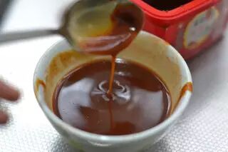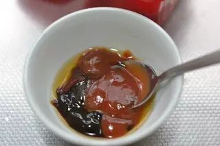 7、配制“三汁”,韩国辣酱15g半大勺,蚝油一大勺15g,番茄酱一勺半25g,盐和鸡精适量(按照这个比例调配的碗汁酸甜中微辣,酸甜中还带有蚝油的鲜味,配比中番茄酱较多。如果喜欢辣的就用25g韩国辣酱,需要注意韩国辣酱是膏状所以一大勺大约30g,请大家酌情根据个人口味添加)。