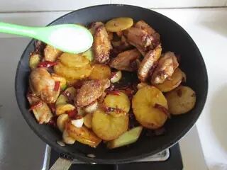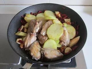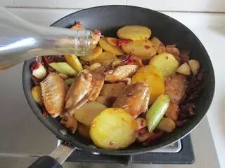 8、下入煎过的鸡翅和土豆片翻炒;