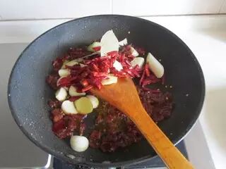6、烧热锅,放少许油,加入豆瓣酱煸炒出红油;