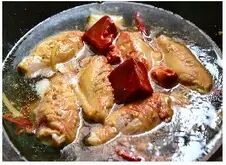 6、加入1汤匙腐乳汁和2块腐乳,以中小火焖烧,待锅内收汁时。