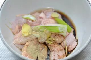 6、鸡翅控干水分加入料酒一大勺,生抽一大勺,葱姜适量,胡椒粉少许,盐四分之一小勺,腌制15分钟(这样初步入味也去除腥味)。