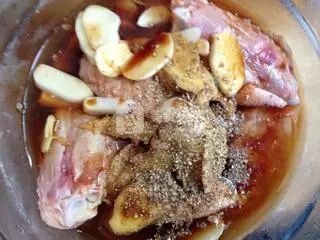 1、将鸡翅刮洗干净,把底部用刀划浅口以便入味,加入半汤匙红烧汁、2茶匙黄酒腌制15分钟。