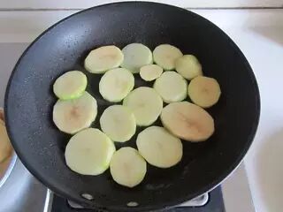 5、这时你会发现锅中还有少许油,将土豆片平铺在锅底,也将两面煎至金黄后盛出;