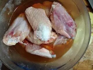 3、鸡翅洗净装入大碗里,糖醋姜的糖醋倒入鸡翅内腌住。