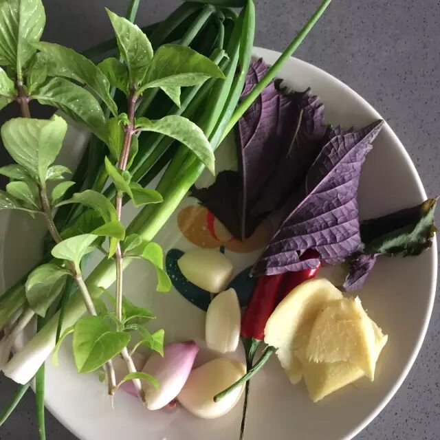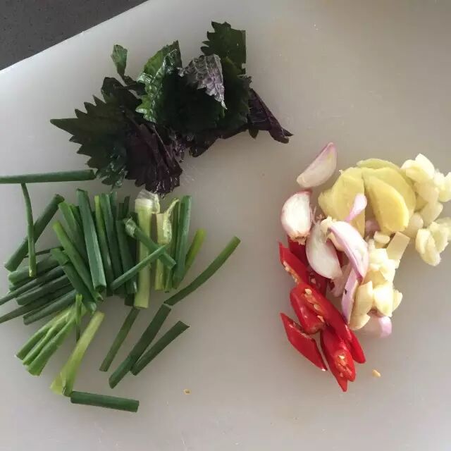 葱切段、小尖椒斜切成段、姜和红葱头切片、 蒜切粒、紫苏撕成小片、金不换折短备用