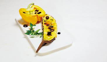 ④往甜椒和长茄里填入马苏里拉奶酪、橄榄、牛至碎和蒜泥。将烧烤架或煎锅加热,同时在甜椒和长茄表面均匀涂上橄榄油。将带馅的一面朝上,放入烤箱烤12~15分钟直至烤透。