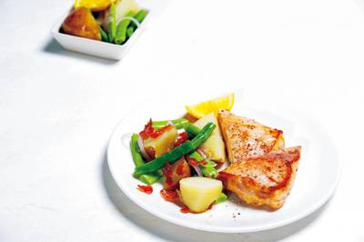 ④起煎锅,把火腿煎2分钟直至酥脆。煎好的火腿用吸油纸控油。撒上火腿碎在四季豆和土豆上,加入蒜末和柠檬汁。