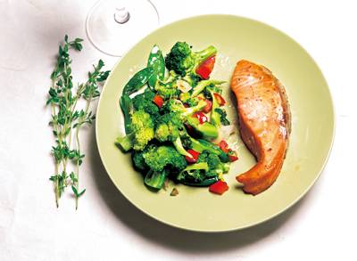 ④热油,放入大蒜、生姜、百里香小炒1分钟,加入西蓝花和红椒爆炒,出锅搭配三文鱼食用即可。