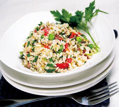 ④将蛋黄酱、柠檬汁和橄榄油混合搅拌作调味酱,拌入米饭中,再混入金枪鱼、青豌豆、红椒、番茄、葱、欧芹即可。