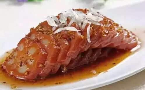 6.半小时后放入冰糖再用小火煮至少半左右。 煮好的糯米藕捞出稍晾凉后便可切片食用了,吃的时候在上面淋上糖桂花和蜂蜜调和的蜜汁,味道美极了!