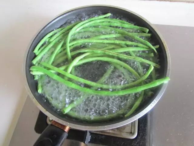 2. 烧锅开水, 将豆角放入里面去焯煮, 加入适量的盐和几滴油;