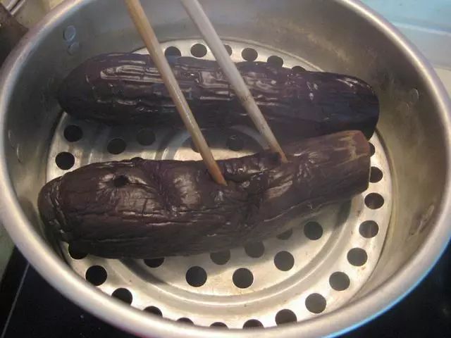 1.长茄子清洗干净,入蒸锅中,大火蒸10分钟左右;