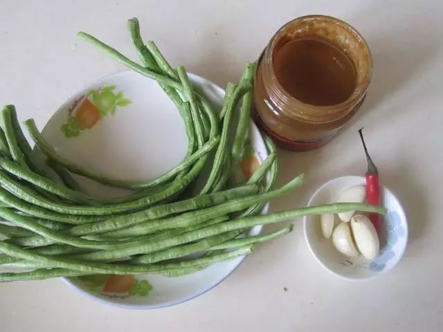 豆角、芝麻酱、蒜、红辣椒、香油、盐