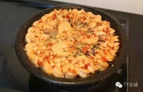 8.将炒好的蒜蓉均匀淋在铁板明虾上,开大火