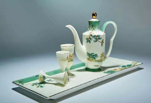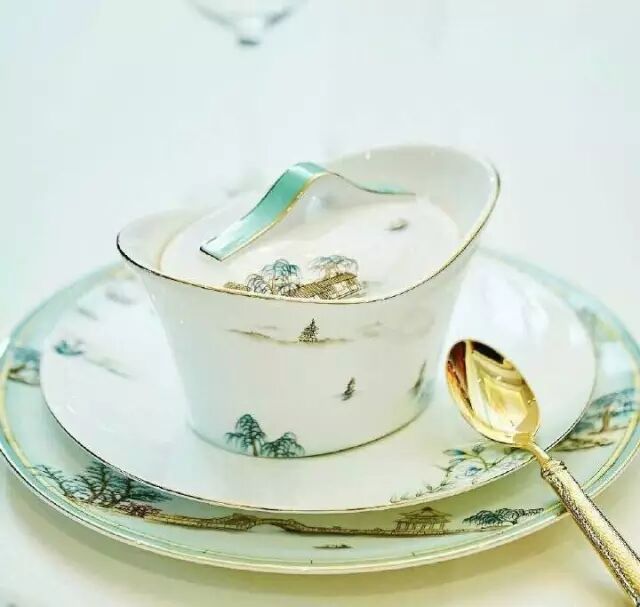 国宴餐具的图案,采用富有传统文化审美元素的“青绿山水”工笔带写意的笔触创造,布局含蓄谨严,意境清新。