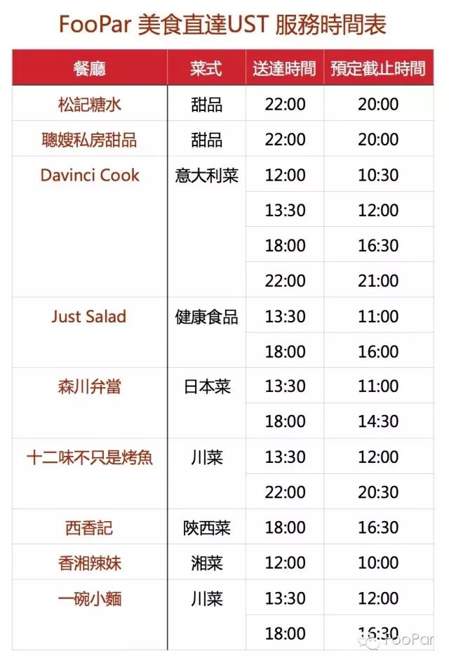 9月5日起,FooPar送餐安排如下,請大家務必于相應截止時間前在FooPar網站上預定心儀的餐品哦~
