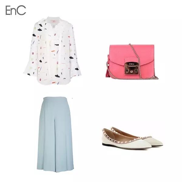 马卡龙色系的阔腿裤是最佳选择,搭配一件简单俏皮的印花衬衫,就可以营造出轻盈的少女感。配合墨绿长马甲,增添层次感。
