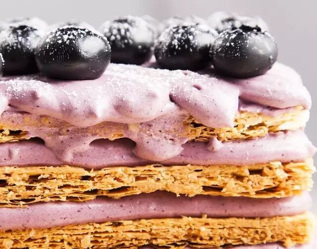 拿破仑蛋糕又称千层酥,包裹着黄油的面皮被烤得层层分明,加以新鲜的蓝莓精心装饰,既能品尝到水果的清甜,又有拿破仑蛋糕的清脆口感。