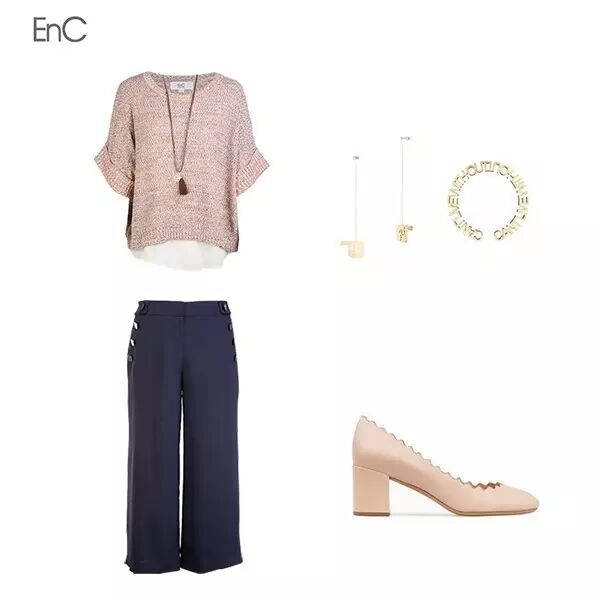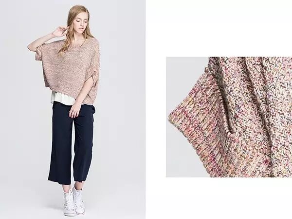 淡淡焦糖色的针织衫,搭配利落的深色阔腿裤,打造恬静舒服的穿搭。
