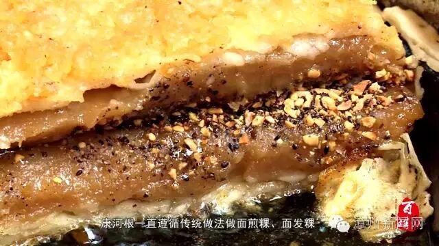 芗城区新华东路318号店前的“老康祖传面煎粿”摊主人康河根,已经做了近四十年的面煎粿,而他的家族做面煎粿的历史,则可上溯百年。康河根的曾祖父原住新华东路后巷,是制作各式粿类的能手,在那一带很有名气。康河根的祖父承父业,民国时在新华东路卖面煎粿等各式粿类。康河根的父亲康海龙,也是解放初期巷口三家做面煎粿的高手之一。康河根自幼跟随父亲,学得一手好手艺。