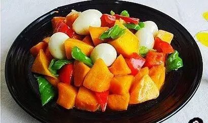 原料: 鹌鹑蛋10个、老南瓜200克、青椒1只、生姜一块、花生油20克、盐8克、味精5克、白糖3克、湿生粉少许。
