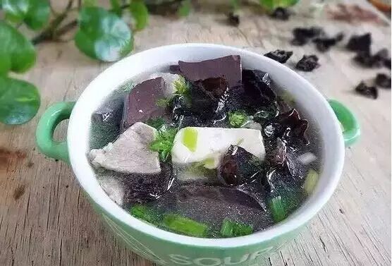 主料:熟猪血 (300克)、水发黑木耳 (100克)、豆腐 (100克)、瘦肉 (100克)