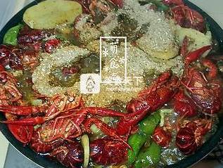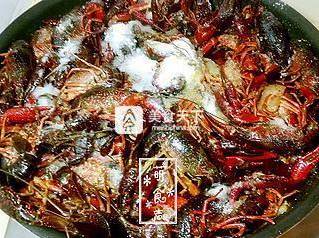 8、加入处理好的小龙虾翻炒至变红,倒入一瓶啤酒,并加水至没过小龙虾。