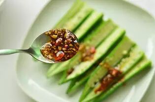 ④ 锅里烧热油,烧至冒烟后浇入辣椒、蒜蓉碗中,拌匀后浇在秋葵上拌匀即可食用