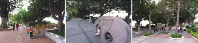 整洁的地面、雅致的景观,长廊上古老的榕树、熟悉的雕塑小品、绿树红花相互衬托,于闹市中予人一份清净,构成了一道独特的城市风景线。