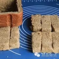 1. 将吐司去顶,用锋利的刀子将吐司中间掏出来;切成三层,每层横三刀、竖三刀切九块。