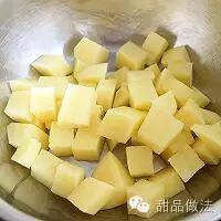 1. 土豆去皮切小块后,放入锅中蒸熟,我用电压锅蒸了8分钟,