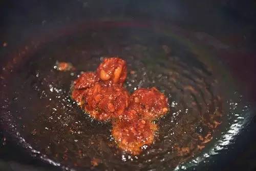 5、倒入适量郫县豆瓣酱,翻炒,一定要小火,防止炒糊。
