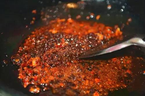 6、倒入适量火锅底料翻炒均匀(就是我们平时买的火锅底料,也可以用老干妈)