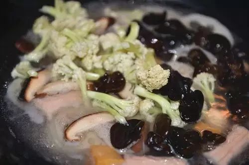 1、把木耳,腐竹提前一天泡上,泡发。与其它蔬菜清洗干净放入锅中煮一下。