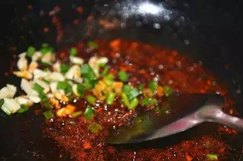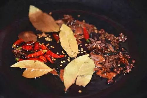 4、锅中多放些油(比平时炒菜多两倍),开最小火,把调料放入油锅中慢慢沁出香味,待调料都变色后捞出,锅中剩油(剩下的油就是秘制五香油,如果不够麻还可以放点麻油)。