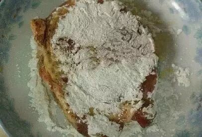 5.将沾满鸡蛋液的大排放入干淀粉盘中使两面沾满干淀粉轻按