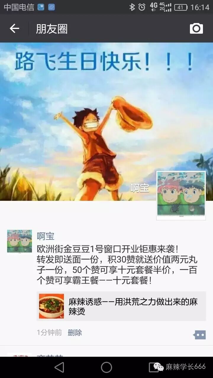 麻辣学长:诶诶,停! 麻辣订餐、派送热线是13346931984,麻辣地址是欧洲街金豆豆餐厅 1号窗口,转发即送面一份,超过50个赞再送丸子一份。彩蛋不?