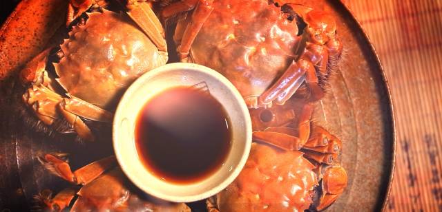 3、用勺子将蟹黄拢到一起,一定要用勺子,一定要用勺子,一定要用勺子(重要的事说三遍)往蟹壳里淋一些姜醋汁,吃掉蟹黄