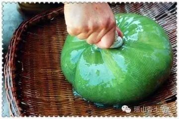山中野生的一种绿色的带香味的叶子制成,把叶子洗净,用手搓或捣成糊状,加适量水,搅匀之后用荷叶盖住。放置阴凉处10-20分钟即成。