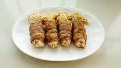 把酱汁浇倒在金针菇卷上就可以了。