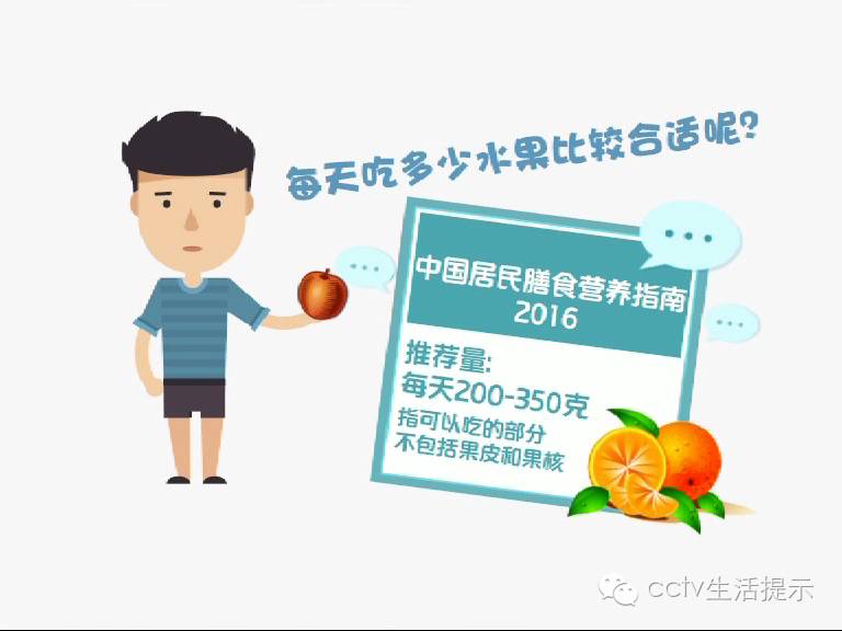 《中国居民膳食营养指南2016》对于我们吃水果给了明确的推荐,它要求是天天都要吃水果,每天的量控制在200-350克,这个重量是指可以吃的部分,不包括果皮和果核。大约就是一个中等大小的苹果,还可以再吃一个橘子,或者是中等大小的橙子,我们再加一个猕猴桃,所以简单的理解我们一天的水果可以控制在1-2个就足够了。